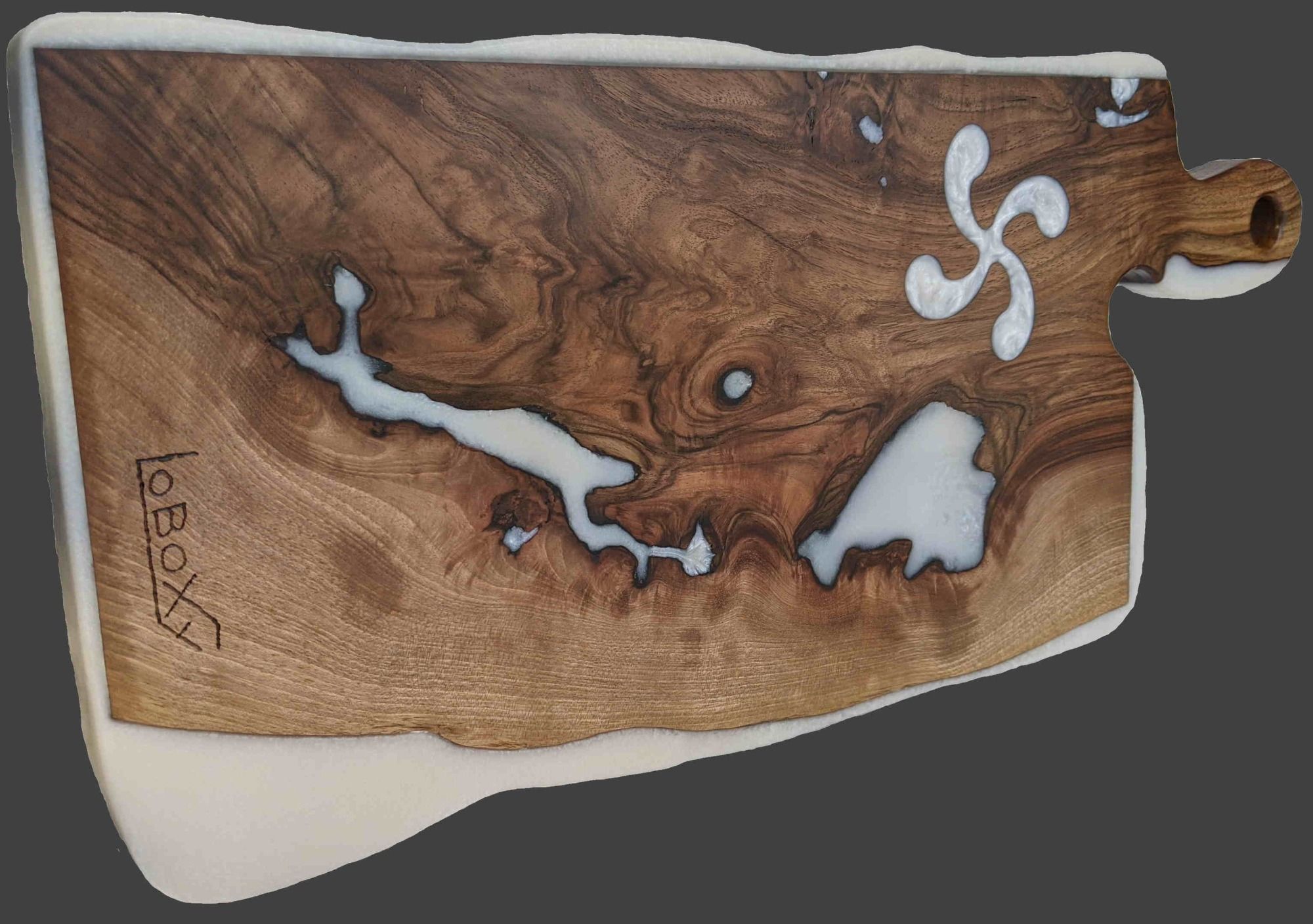 Support en bois (noyer) + résine époxy + Osmo top oil .